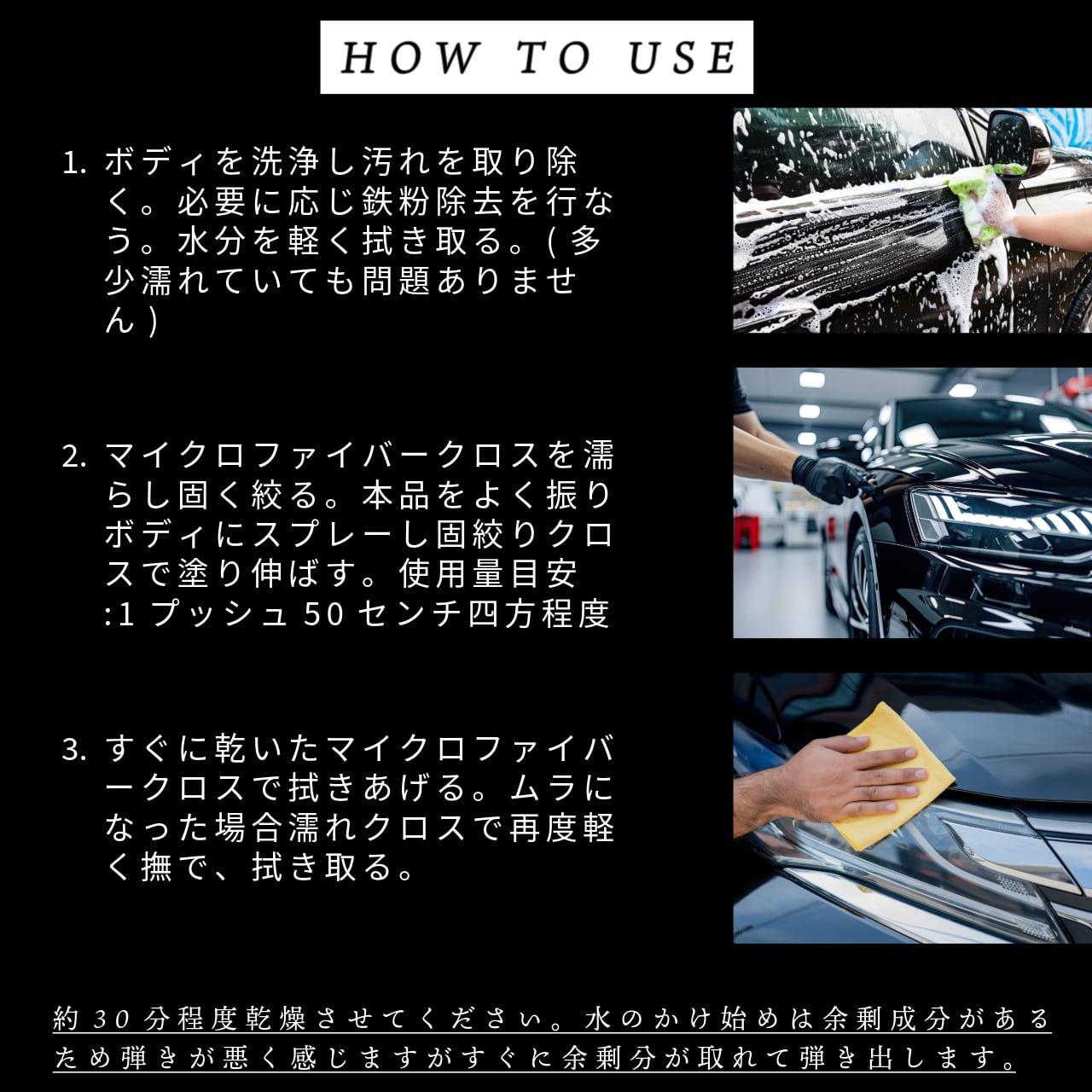 コーティング施工車にも使用できる、艶と撥水を両立したボディコート。1.5か月~3か月の高耐久性を兼ね備え、特殊成分配合でガラス系皮膜を形成し、深い艶と輝きを与えます。