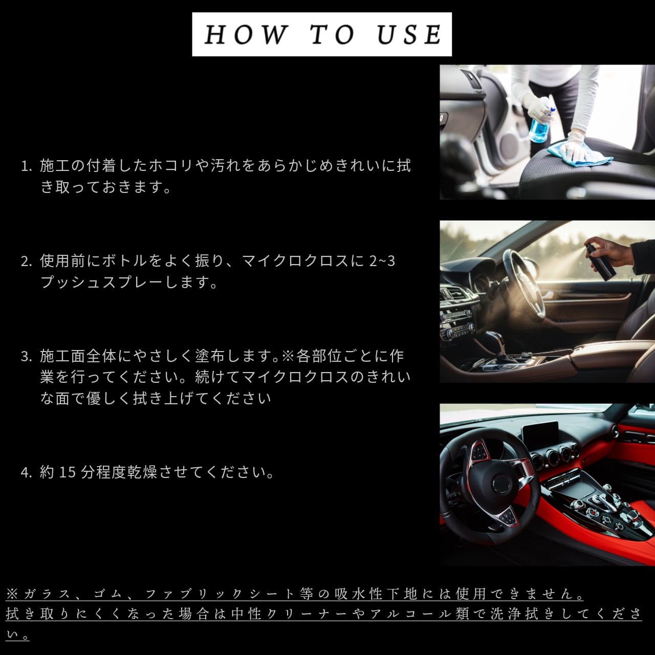 ※ガラス・ゴム・ファブリック等の吸水性素材には使用できません。